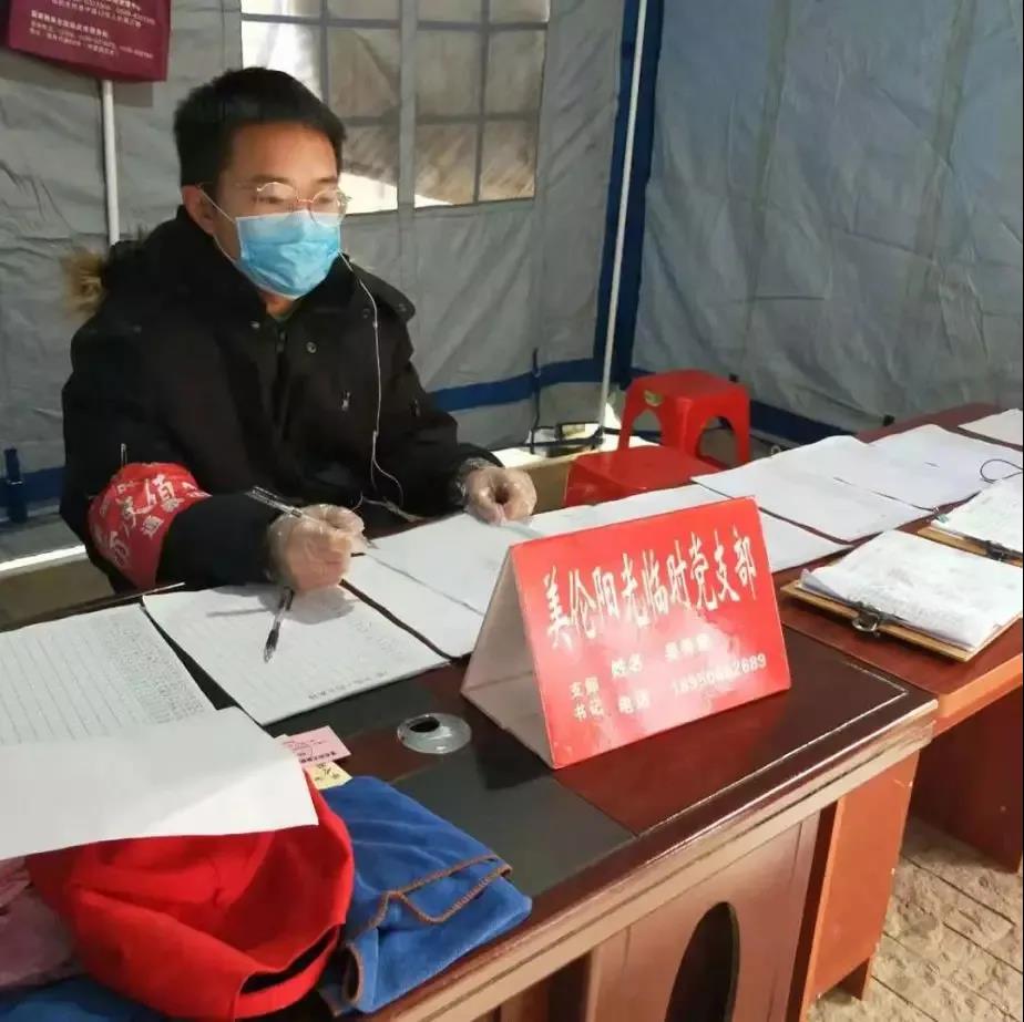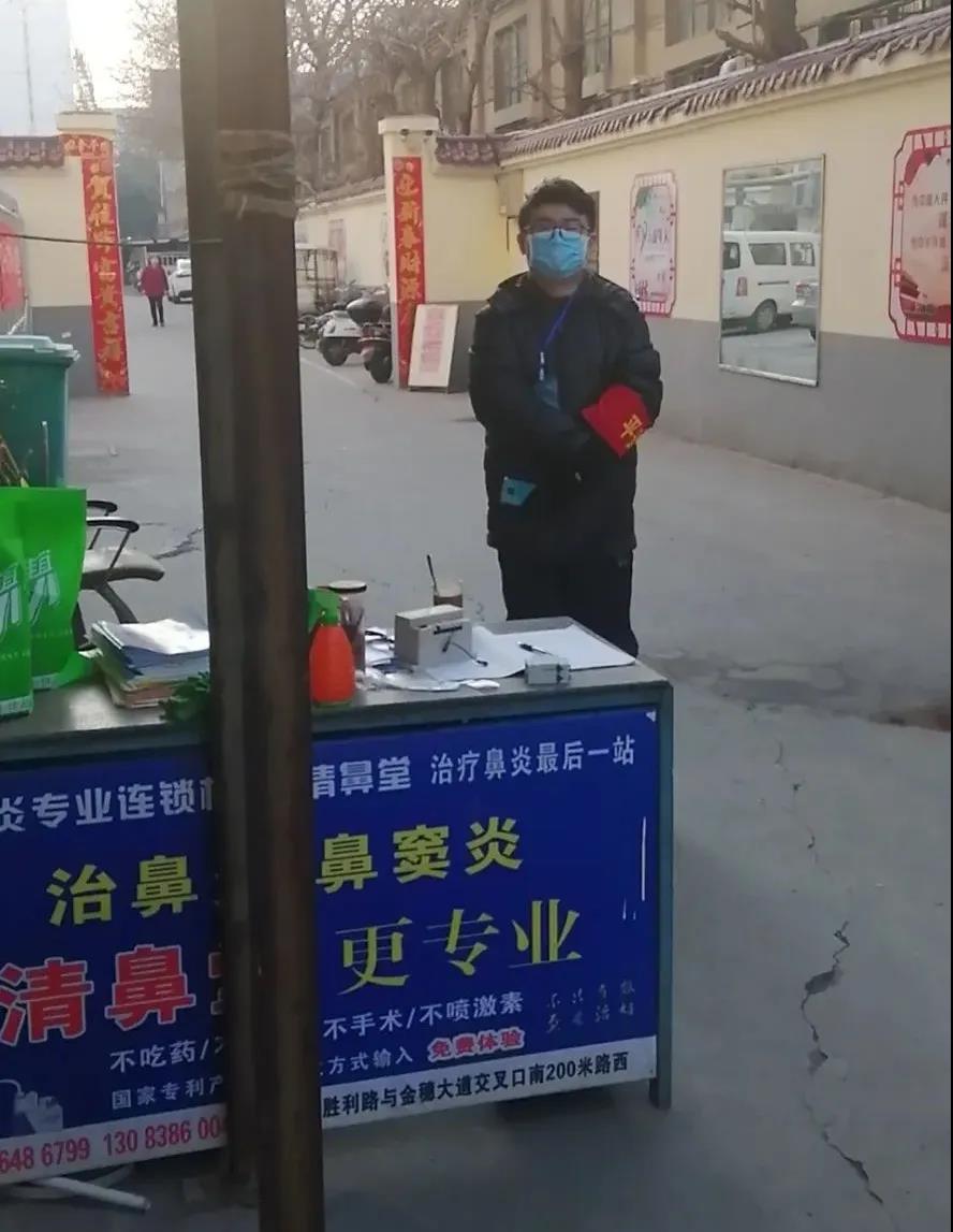 靳少博的主要工作是对每一个出入的人员与车辆进行检查,测量体温,并查看通行证。工作虽然重复单一,为了保障居民们正常的生活状态,他一件都不能落下,一刻都不能松懈。此外,他还与几位年轻的党员挨家挨户发放宣传册,宣传勤洗手,少出门,戴口罩,勤通风;尽量减少外出、聚会,不信谣,不传谣。