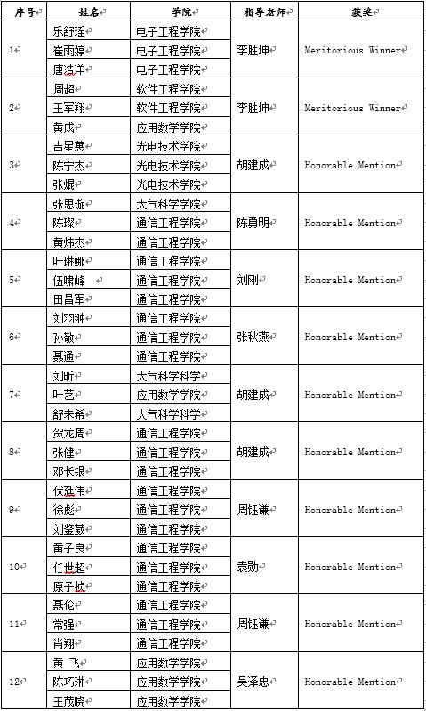 【本网讯】由美国数学及其应用联合会主办的美国大学生数学建模竞赛顺利结束。在学校领导的关怀和教务处的大力支持下,在参赛同学们的辛苦努力下,我校参赛队伍再次取得优异成绩,获得2项Meritorious Winner(国际一等奖)和10项Honorable Mention(国际二等奖)。