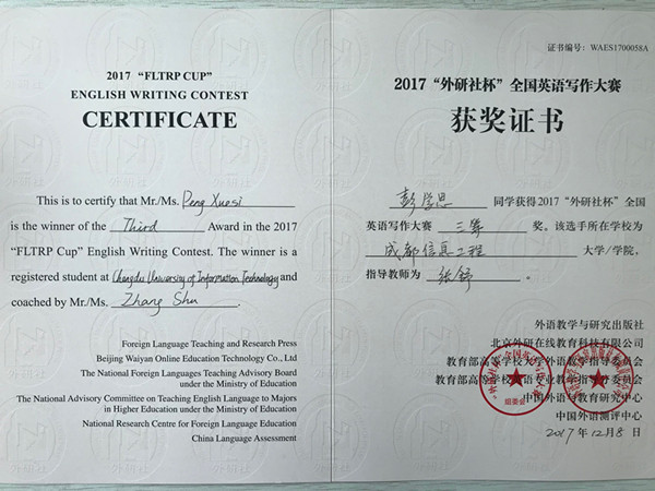 【本网讯】2017“外研社杯”全国英语写作大赛全国总决赛于12月8日在北京外研社国际会议中心落下帷幕。我校网络工程153班的彭学思同学经过校级初赛、省级决赛的层层选拔,以四川赛区第一名的成绩闯入全国总决赛,与从全国五万余名参赛者中脱颖而出的90名选手展开激烈角逐,并最终荣获全国三等奖。这是迄今为止我校学子在该项赛事中所取得的最好成绩。外国语学院张舒老师同时荣获2017“外研社杯”全国英语写作大赛指导教师三等奖。