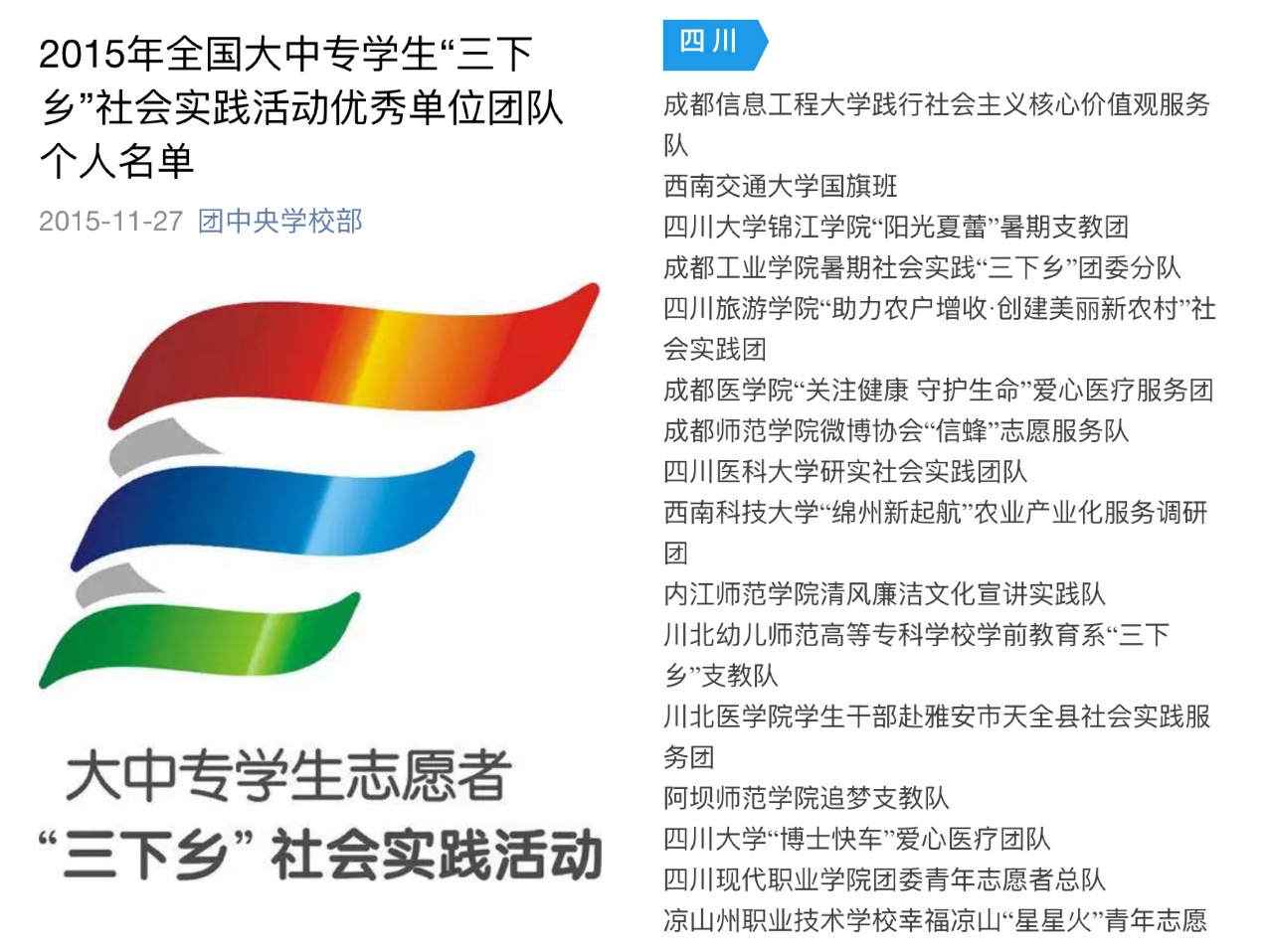 2015年6月,由中宣部、中央文明办、教育部、共青团中央、全国学联等联合下发通知,部署开展了全国大中专学生志愿者暑期“三下乡”社会实践活动(以下简称“三下乡”活动)。活动紧紧围绕学习宣传贯彻习近平总书记系列重要讲话精神,以“践行‘八字真经’投身‘四个全面’”为主题,共组织全国、省级、校级重点实践团队共约9.8万支,860多万人次青年学生参与,取得积极的育人成效和较好的社会反响。我校“悟空官方网站践行社会主义核心价值观服务队”经过同以上众多团队的激烈角逐,最终脱颖而出,成为全国400支优秀团队中的一员,并在四川省优秀团队中排名第一,为我校2015年“三下乡”活动画上圆满的句号。