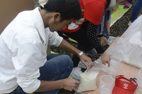 活动开始前,我院志愿者早早地到达现场并积极地为活动的开展做准备,志愿者们分工合作,专心致志地分装活动所需大米、布置现场、将物资摆放到指定位置,为活动的开展打下良好基础。