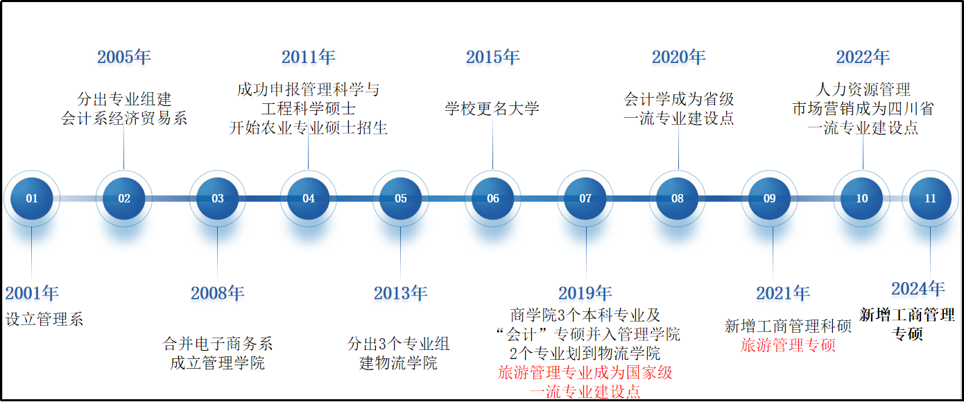 学院始建于2001年,2005年分出专业组建会计系和经济贸易系;2008年,为适应市场经济发展对经济管理人才的需要,并入电子商务系,成立管理学院;2013年—2019年,学校进行学科、专业结构调整,撤销商学院,分出5个专业组建物流学院,将从事管理学类、会计学类教学科研的教师整合至管理学院。管理学院坚持社会主义办学方向,以立德树人为根本任务,以人才培养为中心,以本科教育为主体,大力发展研究生教育,恪守“质量立院、人才强院、特色兴院”的办学理念。立足四川,面向全国,以国家战略、区域经济社会及行业产业发展需求为导向,深度参与地方经济社会建设。以管理学科为基础,融合经济、信息、统计和大气等多学科交叉融合。科教产教融合、政产学研用协同,不断提高人才培养质量,提升科学研究和社会服务水平。致力于培养具备健康心智体魄、良好人文素质、系统理论知识、扎实实践能力的,具有社会责任感、公共意识和创新精神,熟练掌握现代经济管理理论、管理方法及信息技术的,体现“新文科”教育教学理念的应用型、复合型、创新型高级专门管理人才。