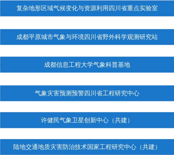 学院目前拥有复杂地形区域气候变化与资源利用四川省重点实验室、气象灾害预测预警四川省工程研究中心、成都平原城市气象与环境四川省野外科学观测研究站等省部级科研与创新平台,并建有气象预报四川省实验教学示范中心、气象预报四川省虚拟仿真实验教学中心以及蜀南山地生态气象综合观测试验站、西南空管局航空气象创新联合实验室、中电投电力工程有限公司电力气象联合实验室、悟空官方网站云南自然灾害防御技术研发中心等教学研究平台。学院建有悟空官方网站气象科普基地,是以气象防灾减灾、气候变化和生态文明为特色的国、省、市三级科普基地。