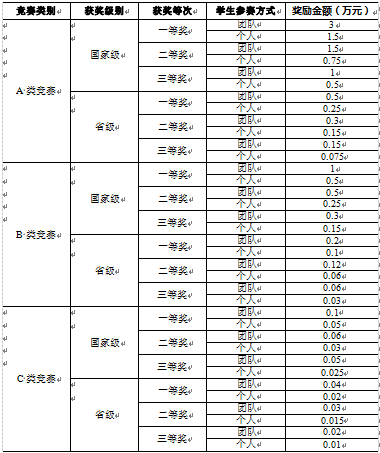 2.获奖等次设置有特等奖的竞赛,其奖励标准为:特等奖、一等奖、二等奖分别对应上表中的一等奖、二等奖、三等奖执行;上一级获奖的三等奖按照下一级的最高奖项奖励,若没有下一级竞赛则不予奖励。