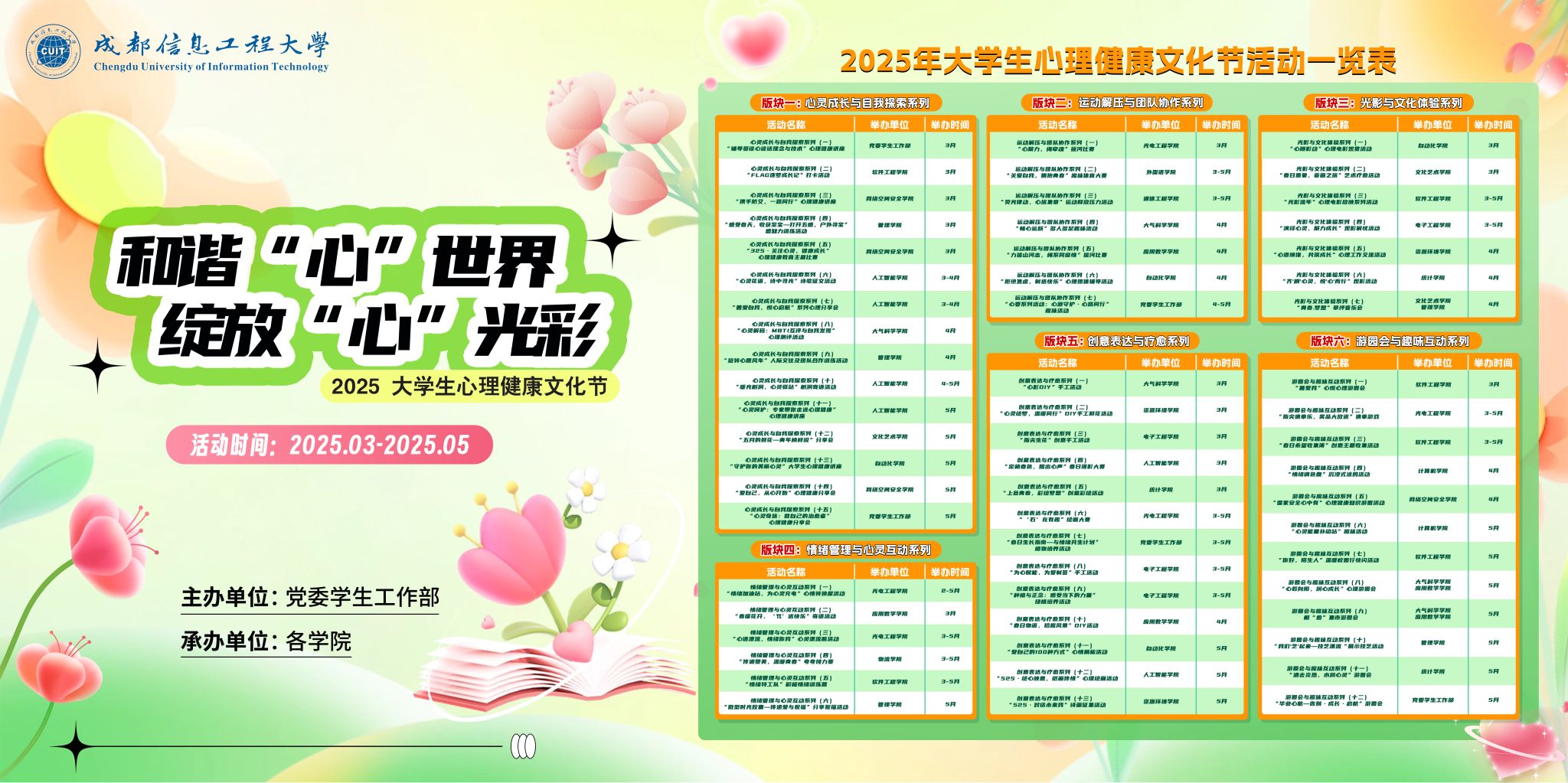 社团文化活力迸发。学生社团结构持续优化,覆盖理论学习、学术科技、体育健身、志愿服务、文学艺术等领域。“学生社团活动季”“社团活动月”“迎校庆游园会”“周末青春SHOW”“暖冬成信”等精品活动已成为校园文化建设的重要载体。爱心6++协会、搏击协会、环境保护协会、排球协会获评成都市百佳学生社团,示范引领作用日益凸显。